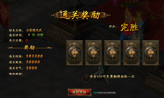 同时,如果你是黄金VIP的玩家,每次通关都必然可以额外多一次抽奖机会。有一定概率获得大量经验、真气、银两、礼金或商城道具。